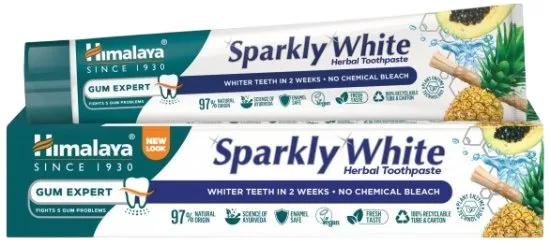 משחת השיניים המלבינה של הימלאיה, מבוססת על פורמולת צמחי מרפא פורצת דרך המכילה אנזימים המופקים מפפאיה ואננס, ומסייעים למנוע היווצרות כתמים על השיניים ומשאירים אותן לבנות יותר.