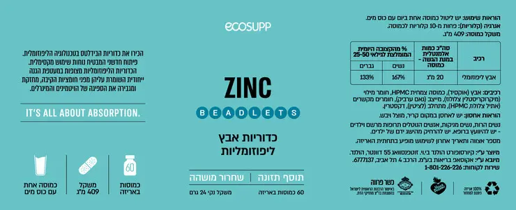 אבץ ליפוזומלי בכמוסות בטכנולוגיית BEADLETS בשחרור מושהה.